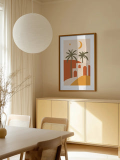 Diese grafische Illustration zeigt zwei Palmen und ein Gebäude vor einem orangefarbenen Hügel. Der Himmel ist mit einem Mond und einem Stern verziert. Die erdigen Töne verleihen dem Bild eine warme und einladende Atmosphäre, die es perfekt für die Dekoration eines Wohnzimmers macht.