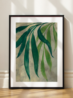 Ein Poster mit grünen Blättern auf einem beigen Hintergrund. Das Motiv wurde mit Pinselstrichen gemalt, die eine künstlerische Note verleihen. Die verschiedenen Grüntöne der Blätter schaffen einen harmonischen und natürlichen Look, der Ruhe und Gelassenheit ausstrahlt. Perfekt für Naturliebhaber und alle, die ihrem Raum eine frische, botanische Atmosphäre verleihen möchten.