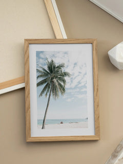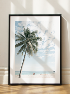 Dieses Poster zeigt eine idyllische Strandszene mit einer majestätischen Palme, die sich über einen weißen Sandstrand neigt. Der Himmel ist klar und blau, mit einigen verstreuten Wolken, die eine friedliche und entspannende Atmosphäre schaffen. Im Hintergrund erstreckt sich das ruhige, türkisfarbene Meer bis zum Horizont. Diese Komposition fängt die Essenz eines tropischen Paradieses ein und bringt eine frische, sommerliche Stimmung in jeden Raum.