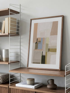 Dieses abstrakte Poster in sanften Pastelltönen kombiniert verschiedene rechteckige Formen in Beige, Blau, Grün und Rosa. Die harmonische Anordnung der Farben schafft eine ruhige und entspannende Atmosphäre, die sich ideal in moderne Wohnräume einfügt. Perfekt für diejenigen, die eine subtile und dennoch stilvolle Ergänzung für ihr Zuhause suchen.
