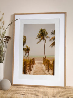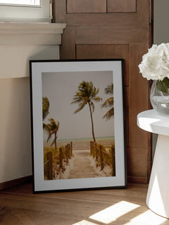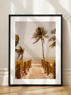 Dieses Poster zeigt eine idyllische Strandszene mit einem hölzernen Weg, der durch den Sand zu einem ruhigen Meer führt. Umgeben von sanft wiegenden Palmen und einem klaren Himmel, vermittelt das Bild ein Gefühl von Ruhe und Entspannung. Perfekt für alle, die das Sommerfeeling in ihre Wohnräume bringen möchten.