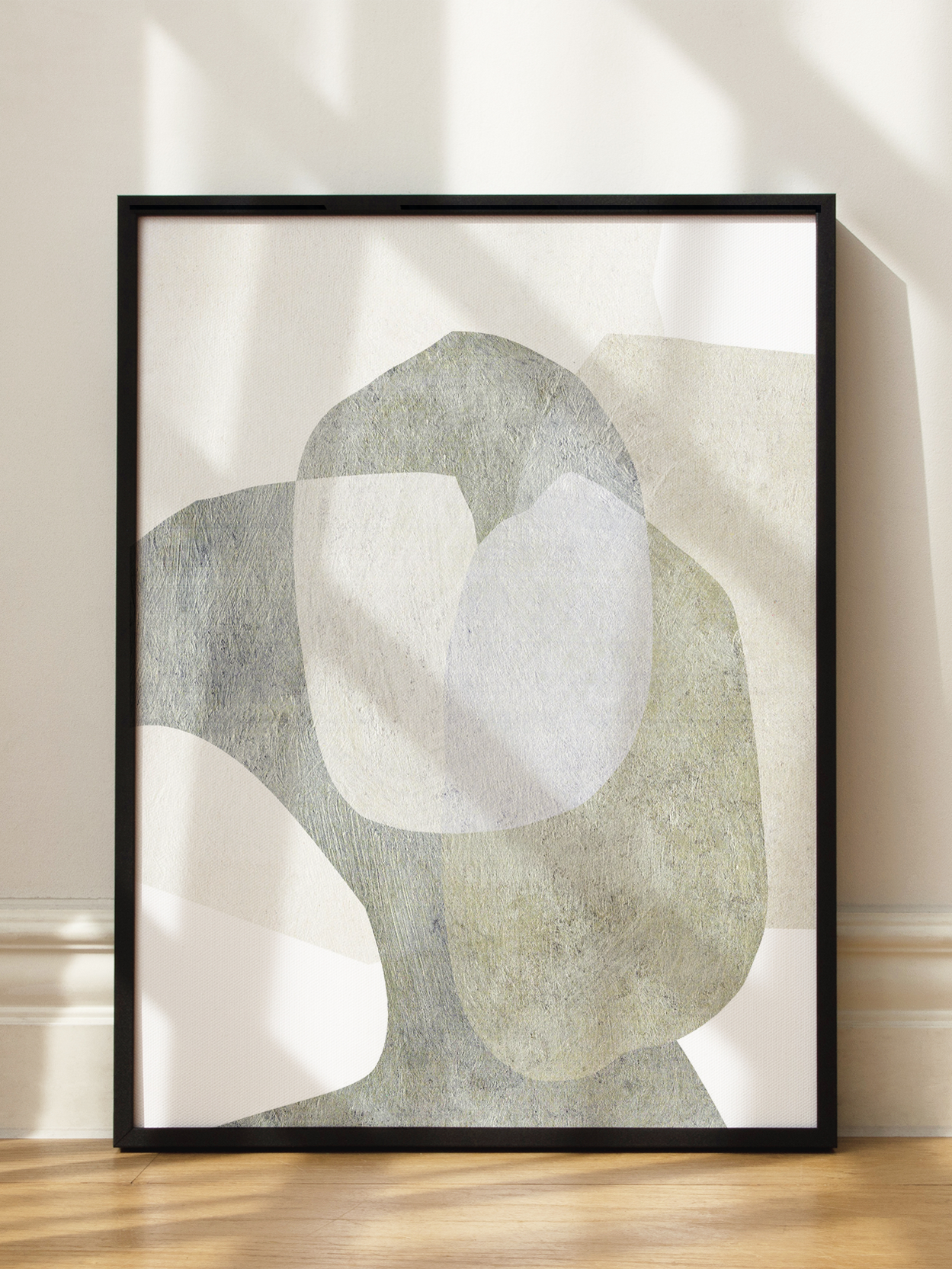 Dieses Poster zeigt eine harmonische Komposition aus abstrakten Formen in Weiß und Beige, die an Steine erinnern. Die erdigen Farben und die sanften Übergänge der Formen schaffen eine beruhigende und zugleich moderne Ästhetik. Perfekt für Liebhaber minimalistischer und zeitgenössischer Kunst, fügt sich dieses Kunstwerk nahtlos in verschiedene Einrichtungsstile ein und verleiht jedem Raum eine elegante Note.