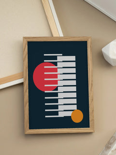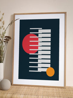 Dieses Poster zeigt ein abstraktes Klavier mit bunten Tasten und zwei auffälligen Kreisen in Rot und Orange auf einem dunklen Hintergrund. Es ist ideal für Musikliebhaber und alle, die ihrer Bilderwand einen lebendigen Farbakzent hinzufügen möchten.