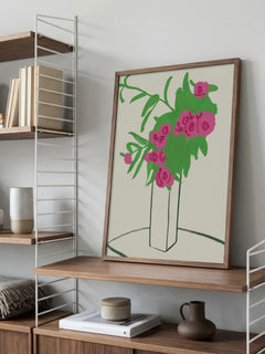 Rosa Blüten in einer schlichten Vase vereinen Frische und Eleganz. Die leuchtenden Farben setzen einen fröhlichen Akzent in jedem Raum. Funktioniert besonders gut über dem Bett oder Sideboard.