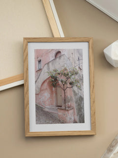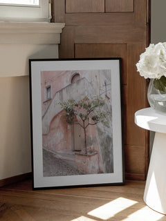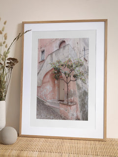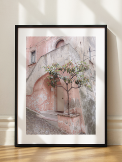 Diese Fotografie zeigt einen kleinen Baum vor einem charmanten rosa Gebäude mit verwitterten Wänden. Die Kombination aus dem zarten Rosa des Gebäudes und dem satten Grün des Baumes schafft eine harmonische und einladende Atmosphäre. Dieses Bild eignet sich hervorragend, um jedem Raum einen Hauch von Farbe und architektonischem Flair zu verleihen.