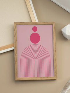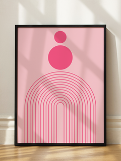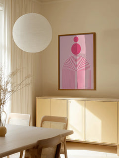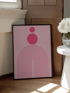 Dieses Poster zeigt eine minimalistische Grafik mit zwei rosa Kreisen und einem Bogen auf einem hellrosa Hintergrund. Die leuchtenden Farben und die einfache Formgebung machen es zu einem perfekten Kunstwerk für ein kreatives Zuhause. Es strahlt eine moderne und frische Atmosphäre aus, die jedem Raum einen Hauch von Lebendigkeit verleiht.