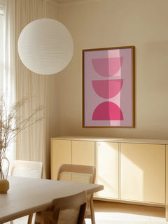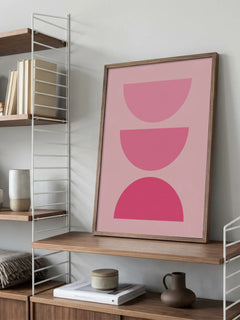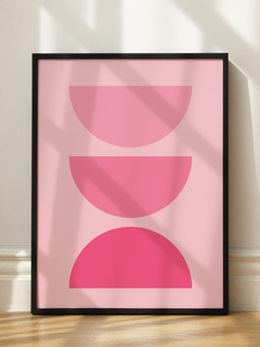 Dieses Poster zeigt eine grafische Illustration mit drei rosa Halbkreisen in verschiedenen Farbtönen, die vertikal auf einem hellrosa Hintergrund angeordnet sind. Die harmonische Farbpalette und das minimalistische Design verleihen jedem Raum einen modernen und frischen Look. Perfekt für Liebhaber von zeitgenössischer Kunst und stilvollen Wohnaccessoires.
