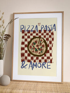 Dieses charmante Poster zeigt eine köstliche Pizza auf einer rot-weiß karierten Tischdecke, die an ein traditionelles italienisches Restaurant erinnert. Der Schriftzug "Pizza Pasta & Amore" in blauer Farbe verleiht dem Bild eine verspielte Note, während das Herzsymbol über dem Wort "Amore" die Liebe zur italienischen Küche unterstreicht. Perfekt für alle, die ihre Leidenschaft für Pizza und Pasta stilvoll zum Ausdruck bringen möchten.