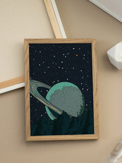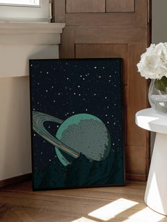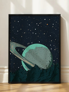 Eine faszinierende Illustration eines grünen Planeten mit Ringen, der hinter einem Berg hervorragt. Der Nachthimmel ist mit funkelnden Sternen übersät und verleiht dem Bild eine mystische und geheimnisvolle Atmosphäre. Dieses Poster ist ideal für Schlafzimmer oder Wohnzimmer, um eine einzigartige und verträumte Stimmung zu schaffen.