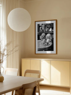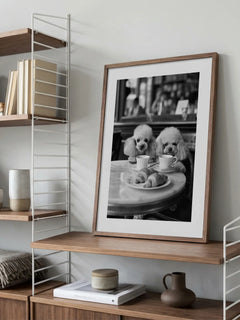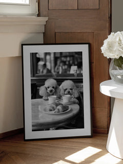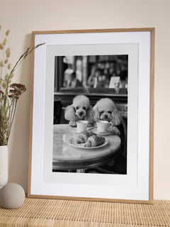 Dieses humorvolle Poster zeigt zwei Pudel, die an einem Tisch sitzen und Kaffee trinken, während sie Croissants genießen. Die Szene ist in einem Café angesiedelt und vermittelt eine charmante und verspielte Atmosphäre. Perfekt für die Küche oder das Esszimmer, bringt dieses Bild eine Prise Humor und Eleganz in Ihr Zuhause.