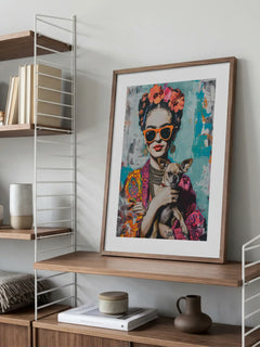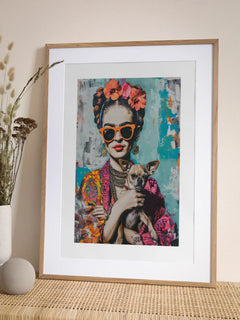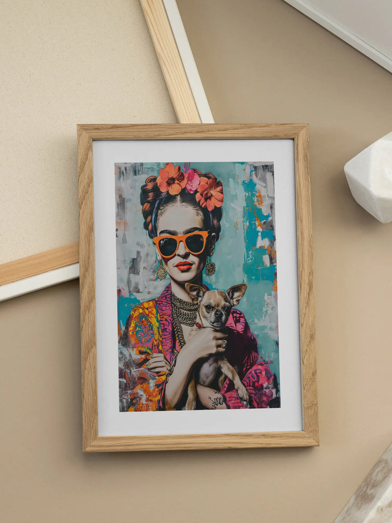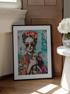 Dieses lebendige Poster zeigt eine stilvolle Frau mit orangefarbener Sonnenbrille, die einen Chihuahua liebevoll in den Armen hält. Sie trägt eine auffällige, bunte Jacke und hat Blumen im Haar, was dem Bild einen fröhlichen und künstlerischen Touch verleiht. Ihre roten Lippen und goldenen Ohrringe betonen ihren eleganten Look. Der abstrakte türkisfarbene Hintergrund verstärkt die moderne und kreative Atmosphäre des Kunstwerks.
