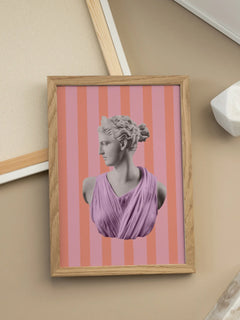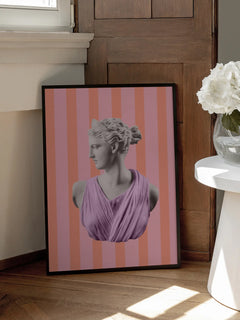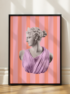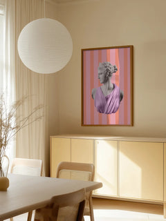 Pop-Art-Poster einer Statue vor einem gestreiften Hintergrund. Dieses Poster fängt den klassischen Pop-Art-Stil perfekt ein. Die Statue wird in einem modernen, farbenfrohen Stil neu interpretiert, was dieses Poster zu einer großartigen Wahl für alle macht, die lustige Dekorationen mit einem modernen, bunten Look mögen.