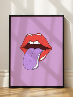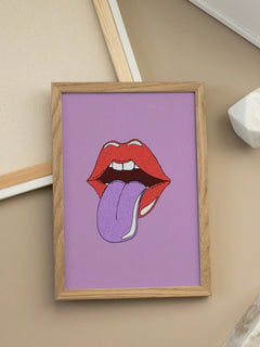 Dieses lebendige Kunstwerk zeigt ein Paar rote Lippen mit einer herausgestreckten lilafarbenen Zunge vor einem strukturierten lila Hintergrund. Die kräftigen Farben und das verspielte Design verleihen jedem Raum einen Hauch von Kreativität und Modernität. Perfekt für alle, die ein auffälliges und einzigartiges Element in ihrer Einrichtung suchen.