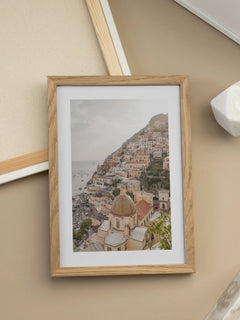 Diese Fotografie zeigt die malerische Stadt Positano an der Amalfiküste mit Blick auf das glitzernde Meer und die majestätischen Berge im Hintergrund. Die bunten Häuser, die sich an den Hang schmiegen, und die Kuppel der Kirche im Vordergrund verleihen dem Bild eine romantische und zeitlose Atmosphäre. Die warmen Farben und das sanfte Licht fangen die Essenz eines perfekten Sommertages ein und bringen ein Gefühl von Urlaub und Entspannung in dein Zuhause.