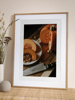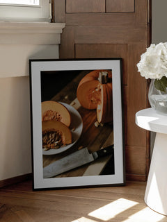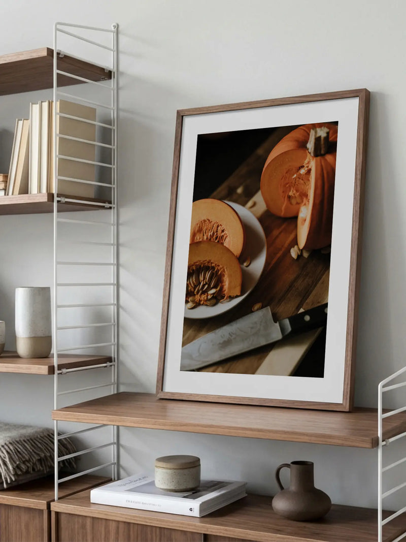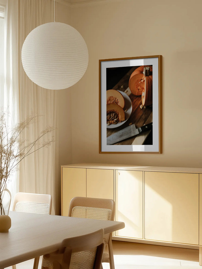 Dieses stimmungsvolle Foto zeigt einen geschnittenen Kürbis auf einem Holzbrett, begleitet von einem scharfen Messer. Die warme Beleuchtung hebt die satten Orangetöne des Kürbisses hervor und schafft eine einladende Atmosphäre. Perfekt als dekoratives Element in der Küche, bringt dieses Bild einen Hauch von Herbst und kulinarischer Inspiration in Ihr Zuhause.