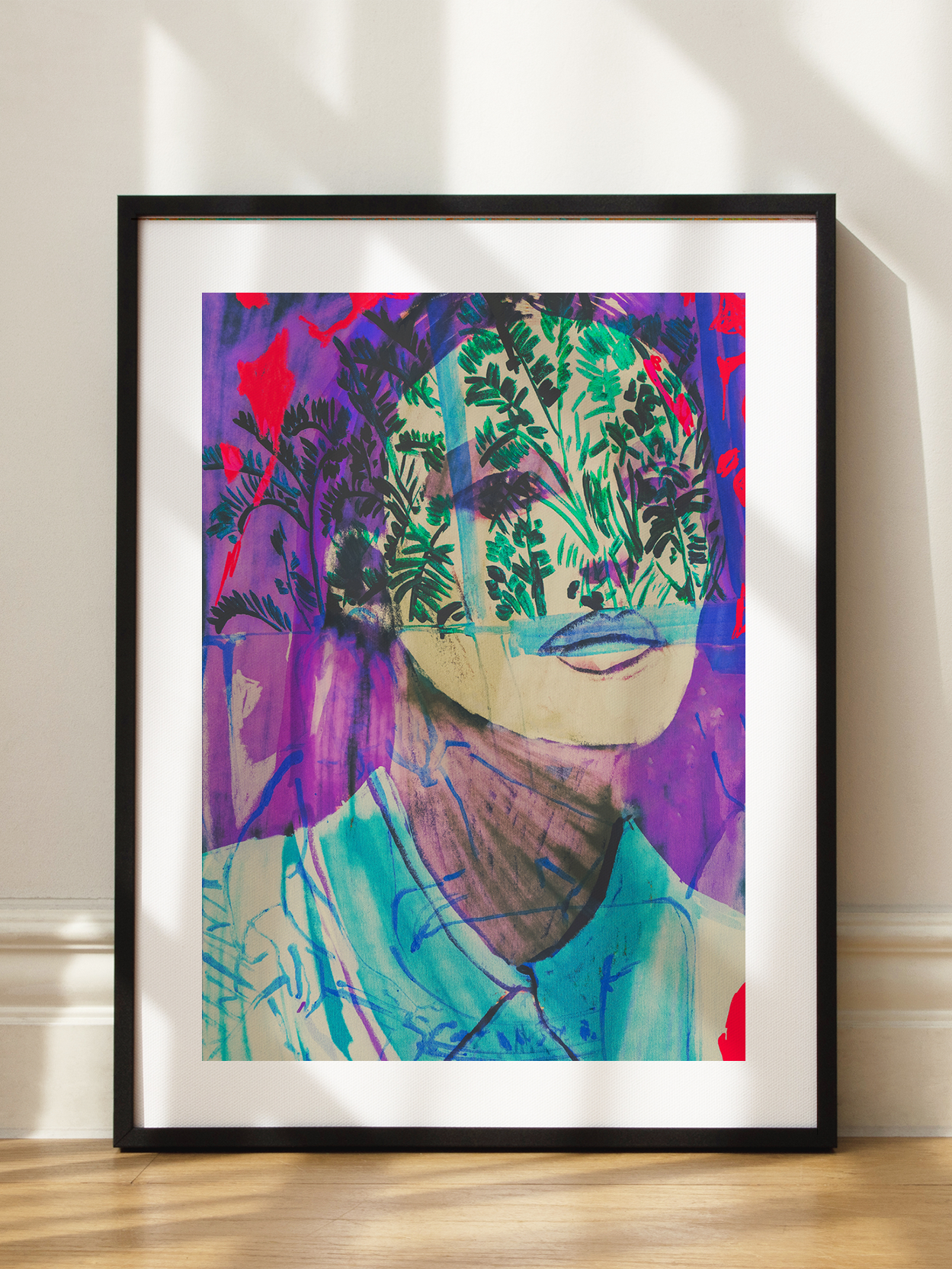 Ein faszinierendes Kunstwerk, das eine Person in einem blauen Hemd zeigt, überlagert mit grünen und roten Blättern vor einem lebendigen lila Hintergrund. Diese Komposition schafft eine eindrucksvolle visuelle Wirkung und bringt eine kreative und künstlerische Atmosphäre in jeden Raum. Perfekt für Liebhaber von moderner Kunst, die ihrem Zuhause einen einzigartigen Touch verleihen möchten.