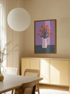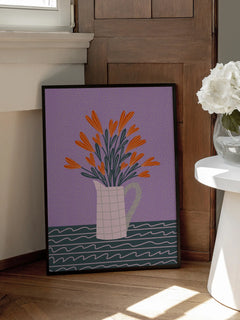 Diese Illustration zeigt eine weiße Kanne, die mit leuchtend orangefarbenen Blumen gefüllt ist, auf einem gestreiften Tisch. Der Hintergrund ist in einem lebendigen Lila gehalten, was dem Bild einen modernen und trendigen Look verleiht. Diese Wandkunst bringt Farbe und Stil in jeden Raum und ist perfekt für Liebhaber zeitgenössischer Dekoration.