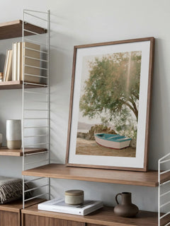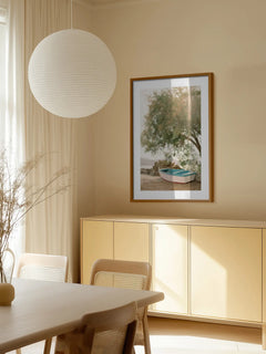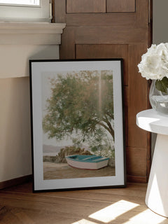 Ein Fotoposter, das ein kleines Boot zeigt, das unter einem großen Baum auf dem Sand liegt. Die Szene strahlt eine ruhige und sommerliche Atmosphäre aus, ideal für alle, die ein Gefühl von Entspannung und Natur in ihr Zuhause bringen möchten. Der Baum bietet Schatten und Schutz, während das Boot auf seine nächste Fahrt wartet.