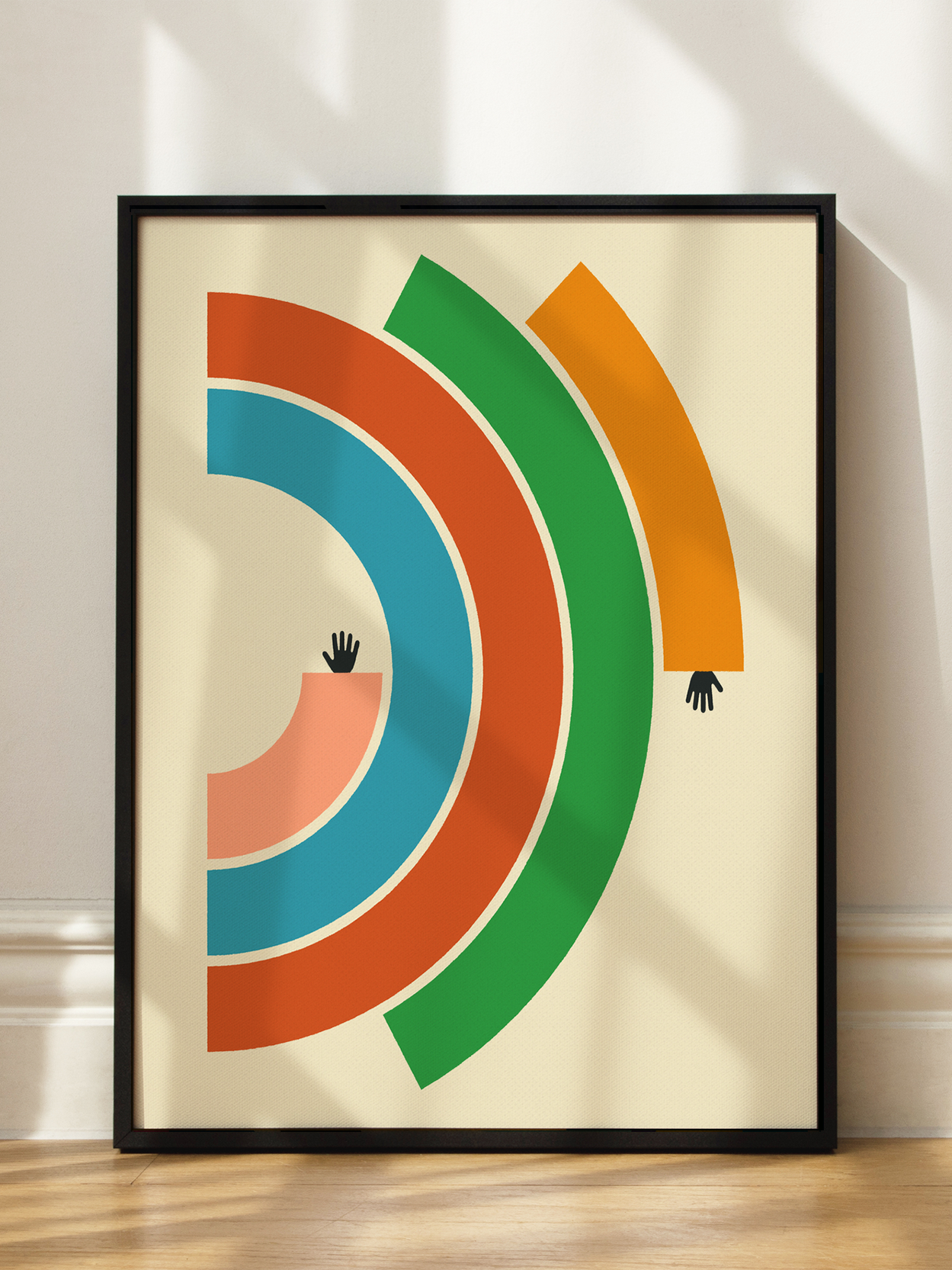 Dieses lebendige grafische Poster zeigt einen Regenbogen in kräftigen Farben auf einem beigen Hintergrund. Die Bögen des Regenbogens sind in Orange, Grün, Blau, Rot und Rosa gehalten. Zwei Hände, eine in Schwarz und die andere in Rosa, ragen aus den Bögen hervor und verleihen dem Bild eine spielerische und dynamische Note. Das Design ist modern und farbenfroh, ideal, um jedem Raum einen frischen und kreativen Akzent zu verleihen.