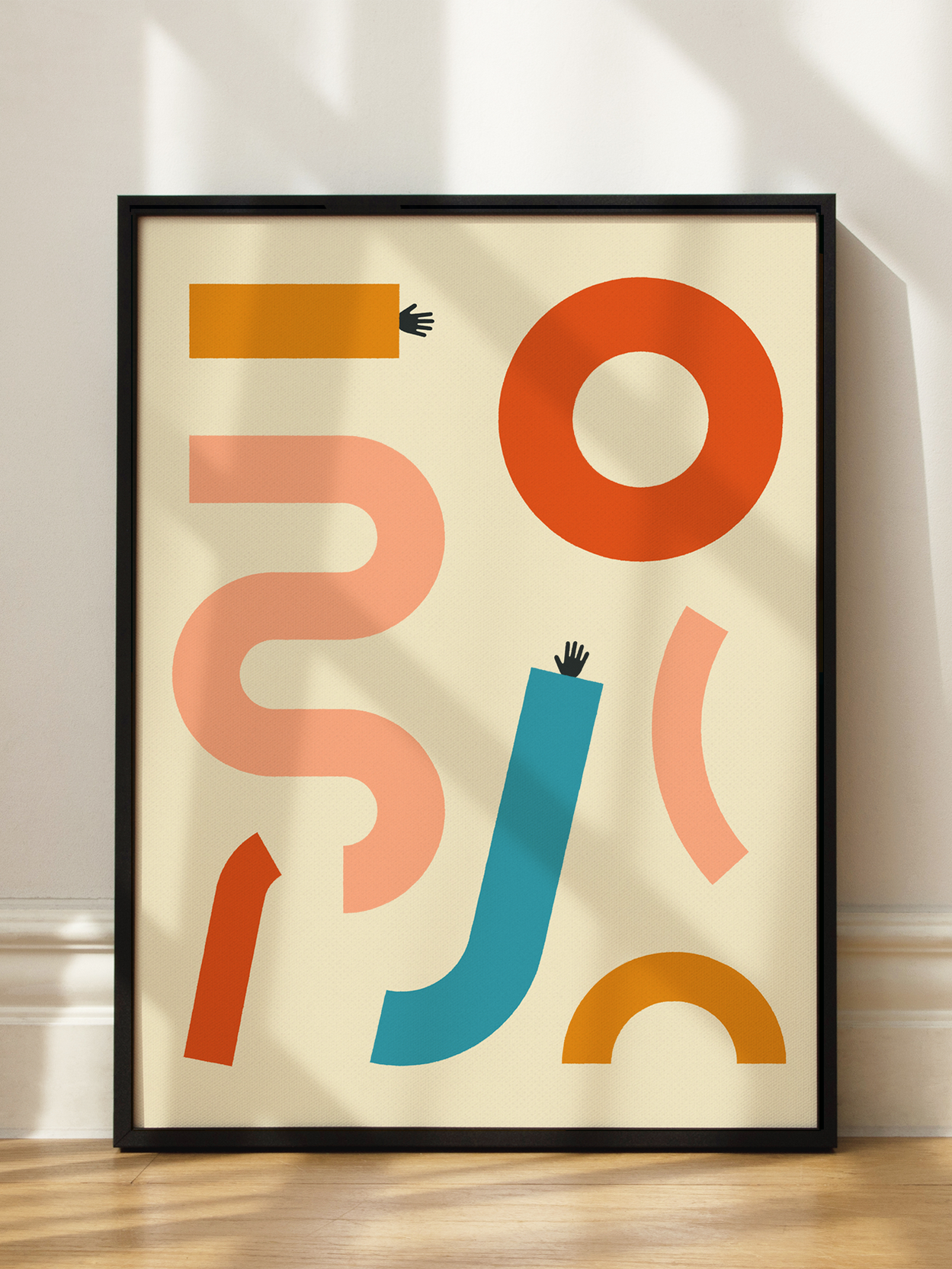 Dieses abstrakte Poster zeigt ausgestreckte Arme in verschiedenen Farben auf einem beigefarbenen Hintergrund. Die geschwungenen Formen und kräftigen Farben verleihen dem Bild eine spielerische und moderne Ausstrahlung. Perfekt für ein farbenfrohes Zuhause, bringt es Energie und Kreativität in jeden Raum.