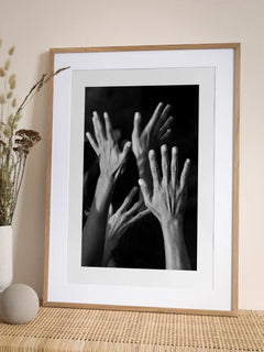 Eine eindrucksvolle Schwarz-Weiß-Fotografie von mehreren Händen, die nach oben reichen. Die Komposition fängt die Dynamik und Energie der Bewegung ein und schafft eine lebendige Atmosphäre. Ideal für alle, die ihrem Zuhause eine kraftvolle und inspirierende Note verleihen möchten.