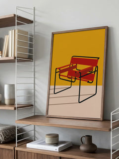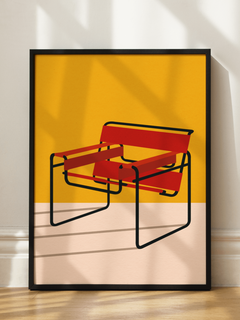Diese grafische Illustration zeigt einen roten Sessel mit einem eleganten schwarzen Gestell vor einem leuchtend gelben Hintergrund. Die klare Linienführung und die kräftigen Farben machen dieses Poster zu einem idealen Blickfang in einem modernen Wohnambiente. Perfekt geeignet, um einem Raum einen Hauch von zeitgenössischem Design zu verleihen.