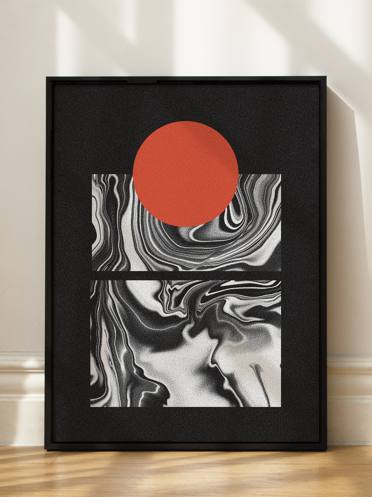 Dieses Poster zeigt eine grafische Illustration mit einem auffälligen roten Kreis, der über einem schwarz-weiß gemusterten Quadrat schwebt. Der Hintergrund ist tiefschwarz, was den Kontrast und die Intensität der Farben verstärkt. Diese moderne Komposition verleiht jedem Raum einen Hauch von zeitgenössischer Eleganz und ist ideal für ein stilvolles Zuhause.