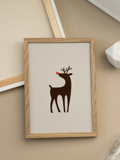 Diese Illustration zeigt ein niedliches Rentier mit einer auffälligen roten Nase auf einem beigefarbenen Hintergrund. Das minimalistische Design verleiht dem Bild einen spielerischen und charmanten Charakter, der perfekt für ein Kinderzimmer geeignet ist. Die einfache Farbpalette und die klare Linienführung machen es zu einem ansprechenden Kunstwerk für die Weihnachtszeit oder das ganze Jahr über.