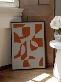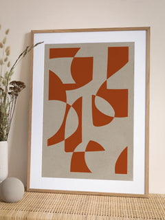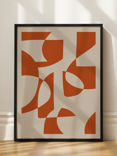 Dieses Poster zeigt eine grafische Illustration mit abstrakten Formen in kräftigem Rot auf einem beigen Hintergrund. Die geometrischen Muster und klaren Linien verleihen dem Bild eine moderne und minimalistische Ästhetik. Perfekt geeignet, um einem Raum mit schlichter Einrichtung einen Hauch von Farbe und Stil zu verleihen.