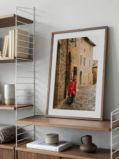 Ein roter Roller lehnt an einer alten Steinwand in einer malerischen, gepflasterten Gasse. Die warmen Töne der Steinmauern und der nostalgische Charme des Rollers verleihen dem Bild eine zeitlose, retro-inspirierte Atmosphäre. Dieses Poster bringt einen Hauch von Vintage-Charme in jeden Raum und ist perfekt für Liebhaber klassischer Fahrzeuge und historischer Architektur.