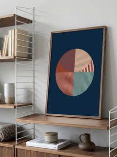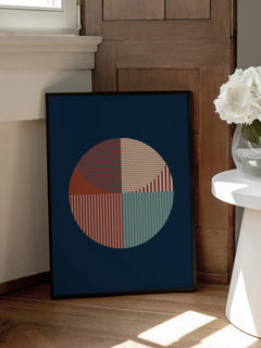 Diese grafische Illustration zeigt einen Kreis, der in vier Segmente unterteilt ist, die jeweils mit Streifen in Blau, Rot und Beige gefüllt sind. Der Hintergrund ist dunkelblau, was den Retro-Look des Posters unterstreicht. Die Kombination aus klassischen Farben und modernen Akzenten verleiht dem Bild eine zeitlose und stilvolle Ästhetik, die in verschiedenen Einrichtungsstilen gut zur Geltung kommt.