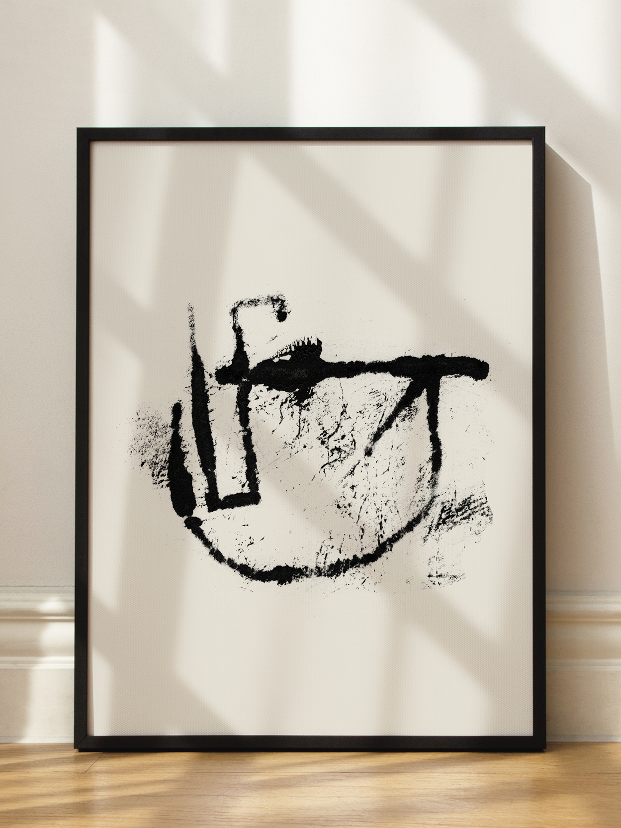 Ein Poster mit einem abstrakten Motiv in Schwarz auf beigem Hintergrund. Die schwarzen Linien und Formen erzeugen ein Gefühl von Bewegung und Dynamik, während der beige Hintergrund eine beruhigende Balance bietet. Dieses Kunstwerk ist ideal für eine moderne und stilvolle Einrichtung und eignet sich perfekt für eine Bilderwand mit anderen abstrakten Postern.