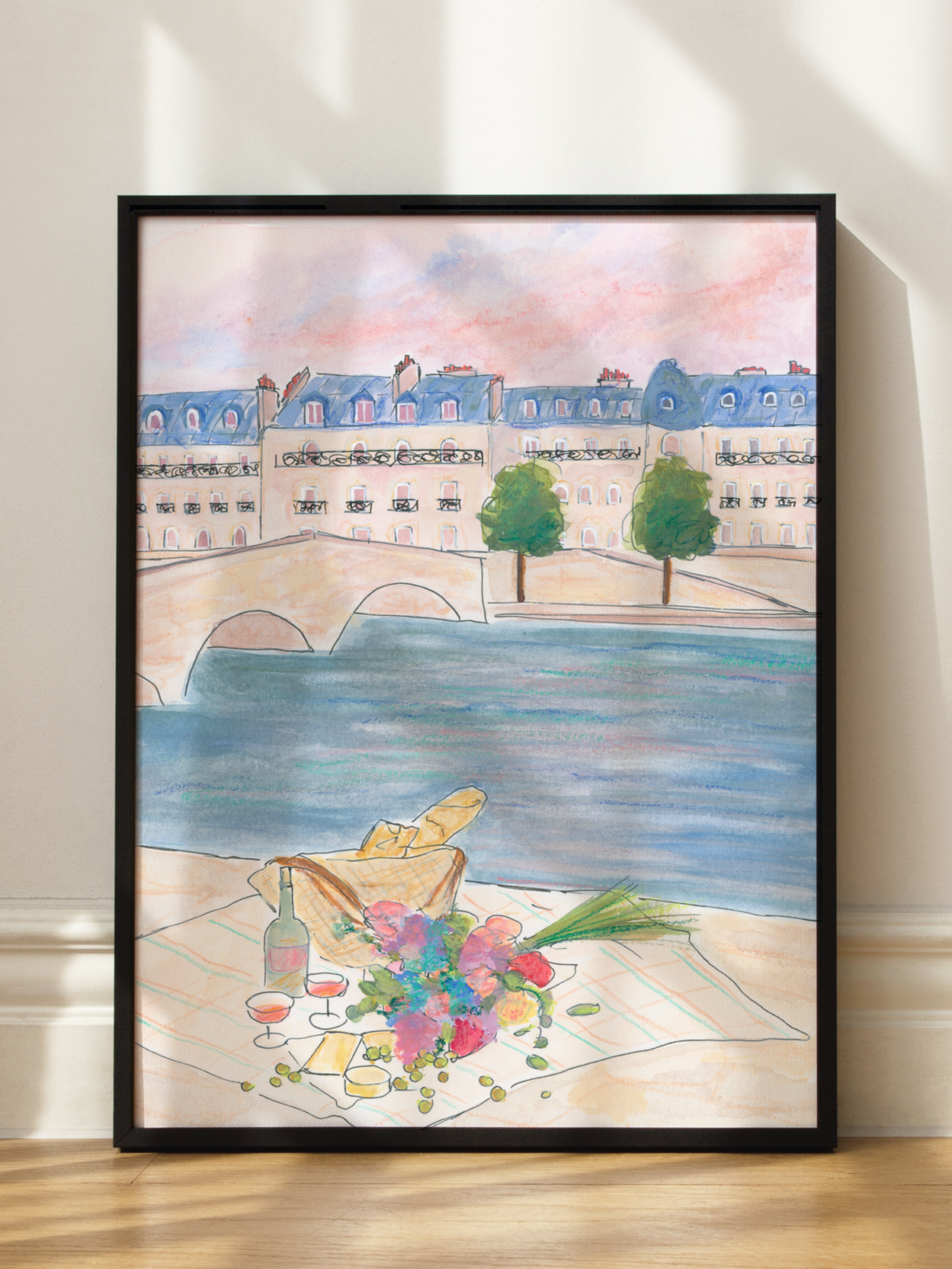 Dieses bezaubernde Poster zeigt ein idyllisches Picknick am Ufer eines Flusses. Im Vordergrund sind eine Flasche Wein, zwei Gläser, Käse und ein bunter Blumenstrauß in Rosa und Lila zu sehen, die auf einer Picknickdecke arrangiert sind. Ein Korb mit einem Baguette vervollständigt die Szene. Im Hintergrund erstreckt sich eine malerische Brücke, flankiert von eleganten Gebäuden, die eine ruhige und einladende Atmosphäre schaffen. Dieses Kunstwerk fängt die Essenz eines entspannten Tages im Freien ein und bringt einen Hauch von Romantik und Gelassenheit in jeden Raum.