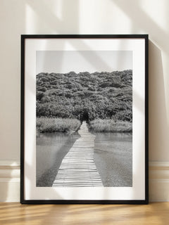 Diese beeindruckende Schwarzweiß-Fotografie zeigt einen Holzsteg, der über einen ruhigen Fluss führt und in einen dichten, grünen Wald mündet. Die Komposition fängt die Ruhe und natürliche Schönheit der Landschaft ein und lädt den Betrachter ein, sich auf eine gedankliche Reise in die Natur zu begeben. Der Kontrast zwischen dem klaren Wasser und dem üppigen Wald verstärkt die Tiefe und Dimension des Bildes.