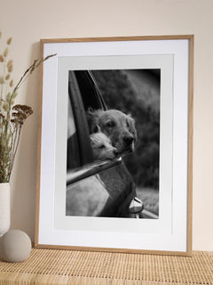 Ein Schwarz-Weiß-Poster von zwei Hunden, die aus einem Autofenster schauen. Diese Fotografie fängt den Geist der Abenteuerlust und die Bindung zwischen den besten Freunden des Menschen ein. Ideal für Tierliebhaber oder diejenigen, die eine nostalgische Note in ihre Wandkunstsammlung bringen möchten.