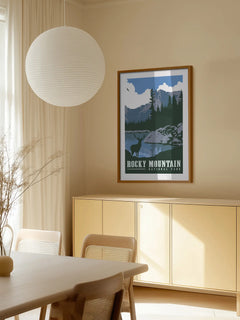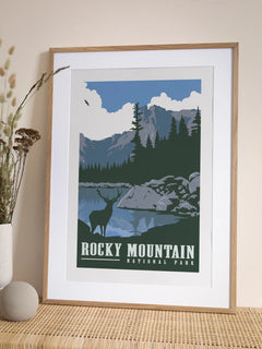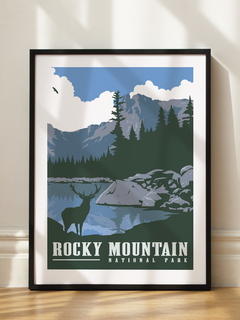 Dieses Poster fängt die majestätische Schönheit des Rocky Mountain Nationalparks ein. Im Vordergrund steht ein eindrucksvoller Hirsch, während im Hintergrund die imposanten Berge und ein klarer See zu sehen sind. Die Szene wird von einem klaren blauen Himmel und vereinzelten Wolken abgerundet, was eine ruhige und erhabene Atmosphäre schafft. Perfekt für Naturliebhaber und alle, die die Wildnis der Rocky Mountains schätzen.