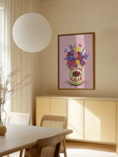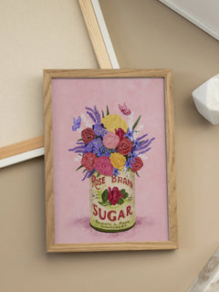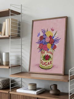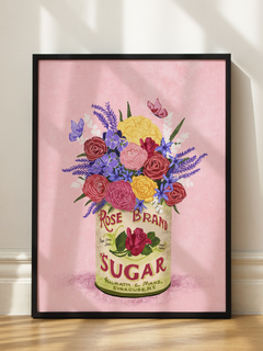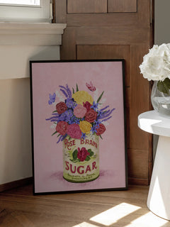 Dieses bezaubernde Poster zeigt einen Strauß aus Rosen, Hortensien und Lavendel, die in einer Dose mit der Aufschrift "Rose Brand Sugar" arrangiert sind. Der Hintergrund ist in einem sanften Rosa gehalten, was die Farben der Blumen besonders hervorhebt. Ein perfekter Farbtupfer, um jedem Raum eine frische und lebendige Atmosphäre zu verleihen.