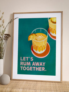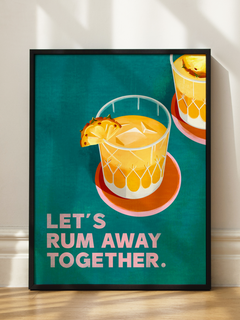 Dieses Poster zeigt einen erfrischenden Rumcocktail mit einer Ananasscheibe auf einem lebhaften türkisfarbenen Hintergrund. Der Text "Let's rum away together" ist in auffälligem Rosa gehalten und verleiht dem Bild eine spielerische und einladende Atmosphäre. Perfekt für Cocktail-Liebhaber und alle, die eine tropische Note in ihre Einrichtung bringen möchten.