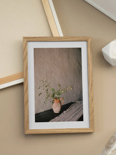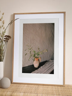 Dieses Poster zeigt eine Fotografie eines Terrakotta-Kruges, der mit Olivenzweigen geschmückt ist und auf einem Tisch steht. Der Krug und die Zweige sind in sanften, natürlichen Farben gehalten, die eine ruhige und friedliche Atmosphäre schaffen. Der Hintergrund ist dezent und strukturiert, was die Einfachheit und Eleganz des Motivs unterstreicht. Ideal, um in jedem Raum eine entspannende und natürliche Stimmung zu erzeugen.