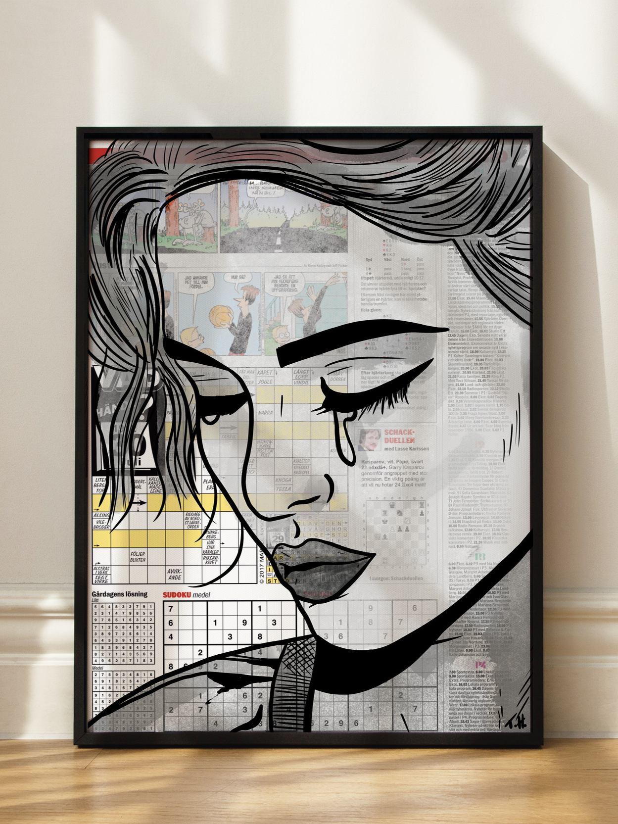 Eine ausdrucksstarke Illustration einer Frau mit geschlossenen Augen und einer Träne, die über ihre Wange läuft. Der Hintergrund besteht aus Kreuzworträtseln, was dem Bild eine kreative und nachdenkliche Atmosphäre verleiht. Dieses Kunstwerk ist ideal für ein kreatives Zuhause und bringt Emotion und Tiefe in jeden Raum.