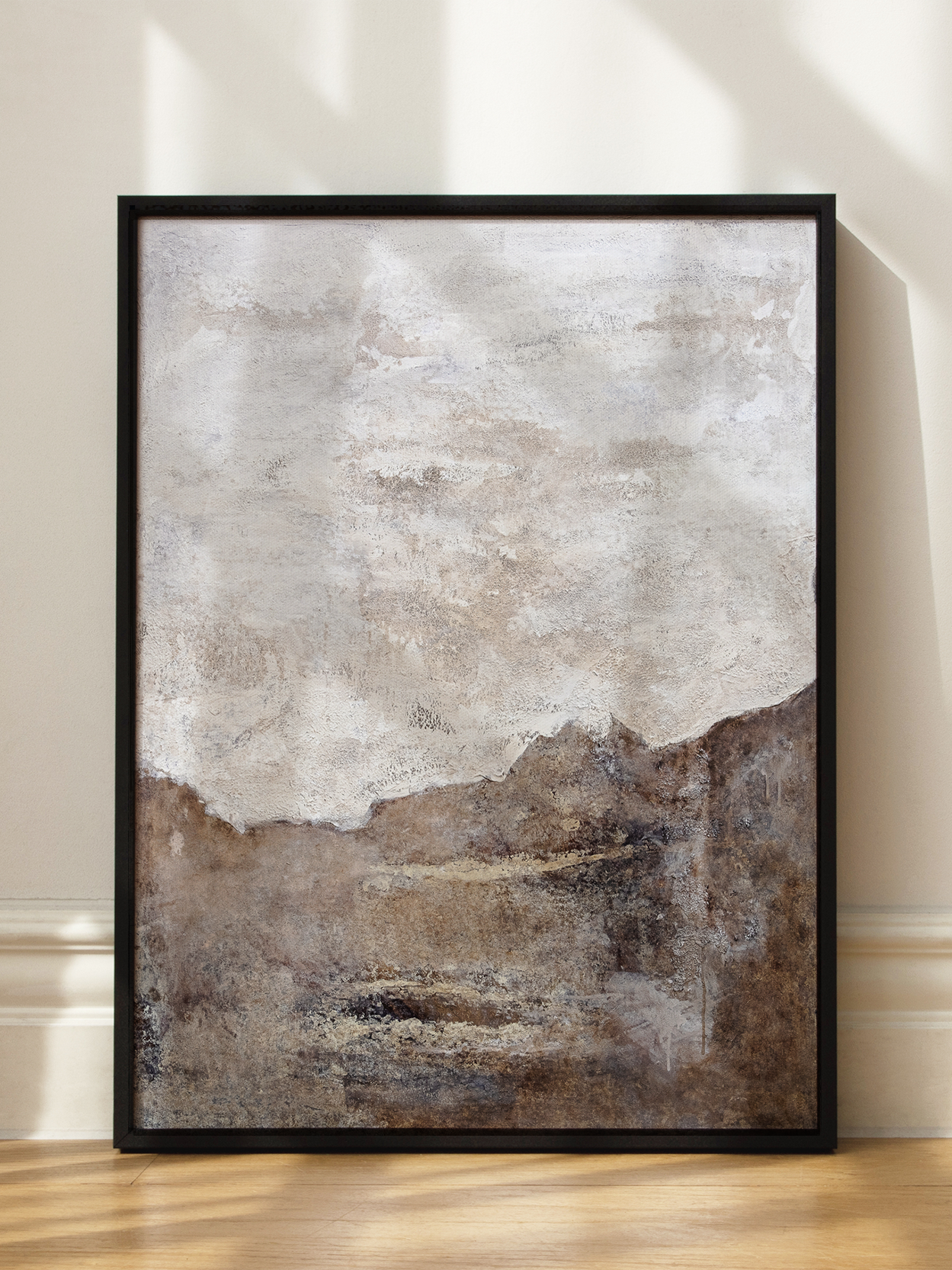 Dieses abstrakte Kunstposter zeigt eine ruhige Landschaft in Erdtönen, die an Sanddünen erinnert. Die sanften Farbübergänge und die minimalistische Gestaltung schaffen eine beruhigende Atmosphäre, die ideal für ein entspanntes und stilvolles Zuhause ist. Perfekt für Liebhaber von minimalistischer und natürlicher Dekoration.
