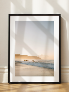 Diese Fotografie zeigt einen ruhigen Strand bei Sonnenuntergang. Die sanften Wellen des Meeres treffen auf den sandigen Uferbereich, während im Hintergrund ein majestätischer Berg zu sehen ist. Die Pastellfarben des Himmels und des Wassers schaffen eine friedliche und entspannende Atmosphäre, die die Schönheit der Natur einfängt. Perfekt für alle, die eine beruhigende und ästhetische Ergänzung für ihr Zuhause suchen.