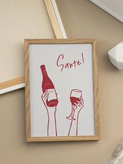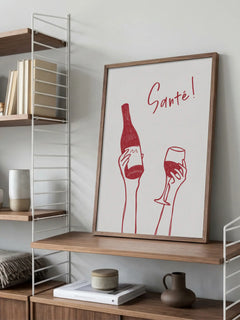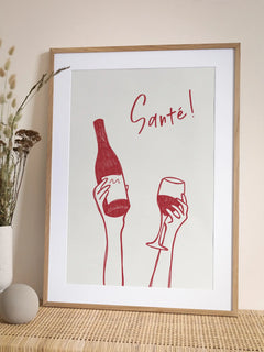 Dieses Poster zeigt eine stilvolle Illustration einer Weinflasche und eines Weinglases in einem kräftigen Rotton. Der Text „Santé!“ ist in einer eleganten Schriftart ebenfalls in Rot gehalten und steht auf einem klaren weißen Hintergrund. Diese minimalistische und dennoch ausdrucksstarke Darstellung ist ideal für die Küche oder das Esszimmer und bringt eine fröhliche und einladende Atmosphäre in jeden Raum.