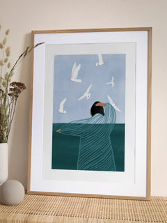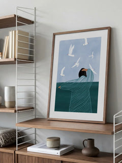 Eine Frau im gestreiften Kleid steht am Meer, während weiße Möwen um sie fliegen. Die ruhige Szene in Türkis- und Blautönen wirkt entspannend und nachdenklich. Funktioniert besonders gut über dem Bett oder Sofa.