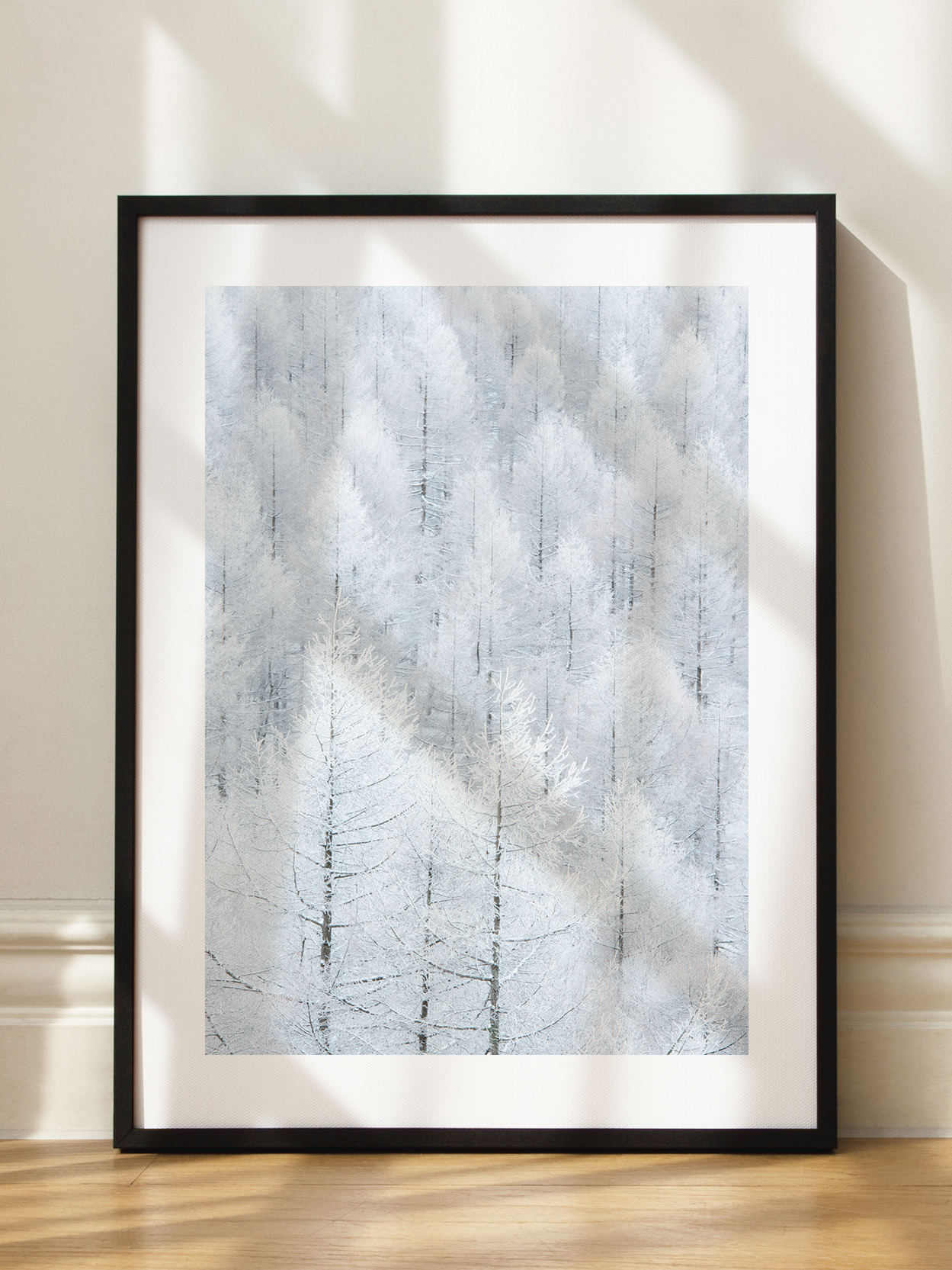 Dieses Poster zeigt eine atemberaubende Fotografie eines verschneiten Waldes. Die Bäume sind mit einer dicken Schneeschicht bedeckt, die eine ruhige und friedliche Winterlandschaft schafft. Die sanften Weißtöne und die zarten Strukturen der Bäume verleihen dem Bild eine beruhigende und erfrischende Atmosphäre. Perfekt, um ein winterliches Gefühl in Ihr Zuhause zu bringen und eine ruhige, natürliche Ästhetik zu schaffen.