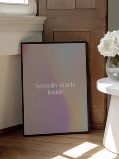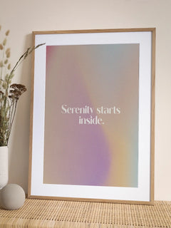 Ein Poster mit dem Zitat "Serenity starts inside" vor einem Hintergrund in sanften Regenbogenfarben. Diese beruhigende Wandkunst erinnert daran, sich Zeit zu nehmen, um sich zu entspannen und in sich zu gehen. Perfekt für Räume, die eine ruhige und meditative Atmosphäre fördern sollen.