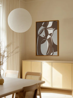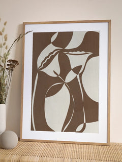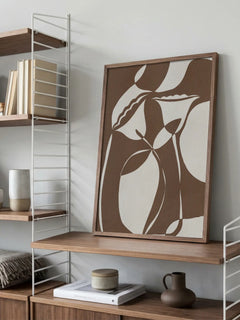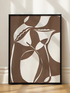 Dieses Poster zeigt eine grafische Illustration von abstrakten Formen und Linien in Weiß und Braun. Die geschwungenen Linien und organischen Formen erinnern an botanische Elemente und verleihen dem Bild eine natürliche und harmonische Ausstrahlung. Perfekt für moderne Wohnräume mit einem minimalistischen Stil, bringt dieses Kunstwerk Ruhe und Eleganz in Ihr Zuhause.
