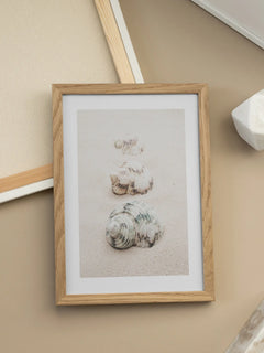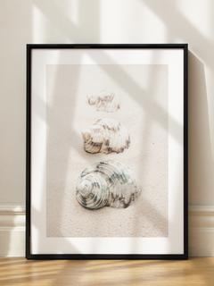 Dieses Poster zeigt eine Fotografie von Muscheln, die im feinen Sand liegen. Die sanften Farben und die natürliche Anordnung der Muscheln schaffen eine beruhigende und sommerliche Atmosphäre. Perfekt, um ein Gefühl von Strand und Meer in dein Zuhause zu bringen.