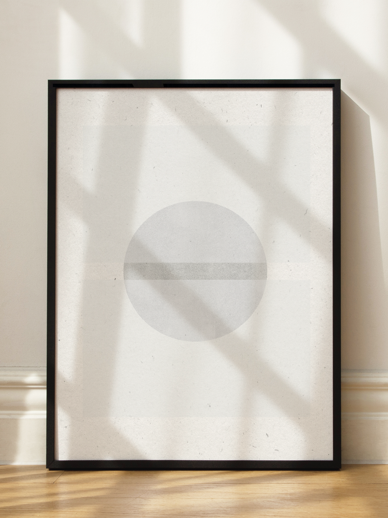 Dieses Poster zeigt eine minimalistische Grafik mit einem zentralen Kreis und einem Quadrat im Hintergrund, alles auf einem strukturierten hellgrauen Hintergrund. Die schlichte Farbpalette und das strukturierte Design verleihen dem Kunstwerk einen einzigartigen und modernen Look, der sich perfekt in eine Vielzahl von Einrichtungsstilen einfügt.