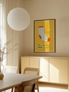 Ein einzelner karierter Socken auf gelbem Grund mit TO/FROM-Beschriftung — humorvolle Weihnachtskarte als Poster. Funktioniert besonders gut in verspielten Räumen und setzt einen augenzwinkernden Akzent.